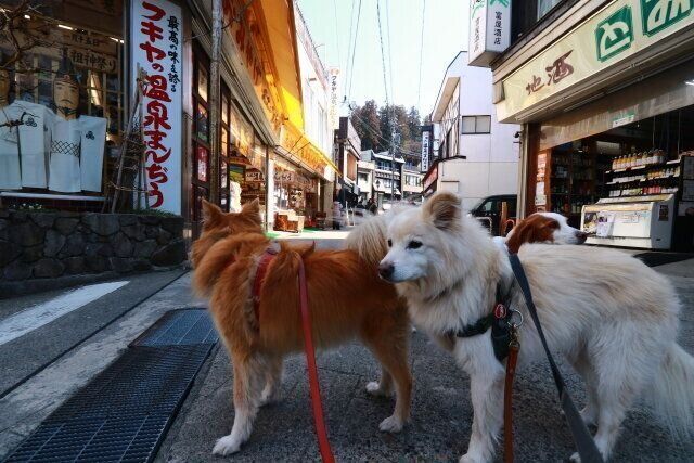 駐車場に到着して、妻と友人を見送った後、私は犬たちと野沢温泉の散策してみた。驚いたことに、野沢温泉村の中は当時の雰囲気とそんなに変わっていなかった。付き合いのあったペンションや民宿がまだやっていて、看板もそのままだったりした。