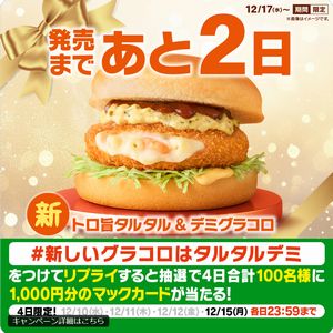 【#新しいグラコロはタルタルデミ 】をつけてリプライすると、抽選で合計100名様にマックカード1,000円分が当たる!