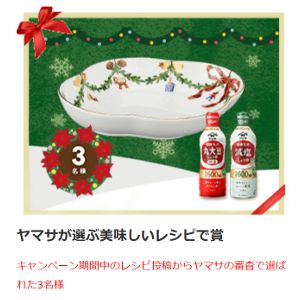 抽選で合計9名様に、ロイヤルコペンハーゲン クリスマスコレクションデッシュ、ロイヤルコペンハーゲン クリスマスコレクションチョコレートボウル2個セット、ロイヤルコペンハーゲン クリスマスコレクションカップ ペア、ヤマサ「鮮度生活 特選丸大豆しょうゆ」とヤマサ「鮮度生活 減塩しょうゆ」のセットをプレゼント!