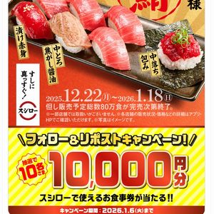 抽選で10名様にスシローお食事券10,000円分が当たる!