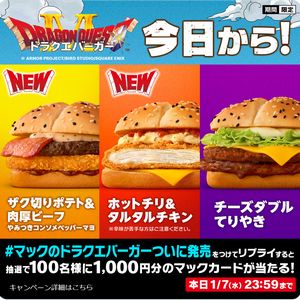 【#マックのドラクエバーガー発売 】をつけてリプライすると、抽選で合計100名様にマックカード1,000円分が当たる!