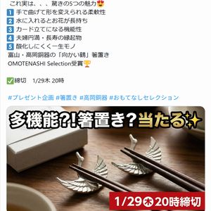 抽選で1名様に富山・高岡銅器の「向かい鶴」箸置きが当たります。