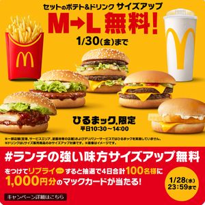 【#ランチの強い味方サイズアップ無料】をつけてリプライすると、抽選で合計100名様にマックカード1,000円分が当たる!