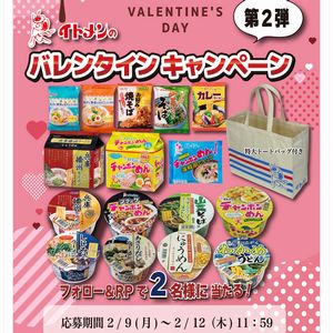 抽選で2名様にイトメン即席めん詰合せと特大トートバッグをプレゼント。