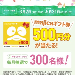 【その場で当たる】majicaギフト券500円分が合計300名様に当たる大量当選キャンペーン!majicaアプリの会員登録を済ませて応募すると、抽選結果がすぐわかります。このお得な懸賞で、賢くお買い物を楽しもう!