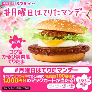 【#かるび焼肉風てりたまでウッキウキ】をつけてリプライすると、抽選で4日合計100名様にマックカード1,000円分が当たる!