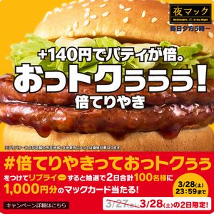 【#倍てりやきっておっトクぅぅ】をつけてリプライすると、抽選で2日合計100名様にマックカード1,000円分が当たる!