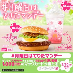 【#月曜日はてりたマンデー】をつけてリプライすると、抽選で4日合計100名様にマックカード1,000円分が当たる!