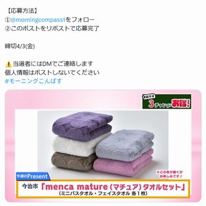 今治市「menca mature(マチュア)タオルセット」が3名様に当たる!