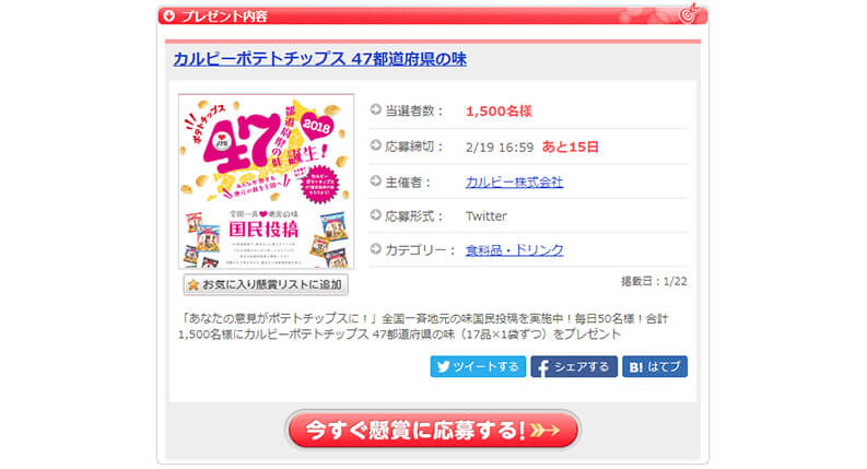 2019年2月7日現在、キャンペーンの第2弾が開催中で、2月19日(火)まで応募可能。当選者1,500人に「カルビーポテトチップス 47都道府県の味(17品×1袋ずつ) 」が当たるという懸賞好きなら思わずテンションが上がる当選品です。(※現在キャンペーンは終了しています)