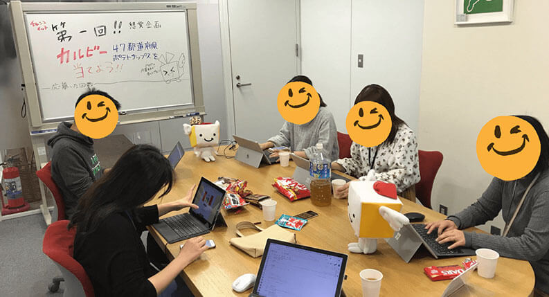 チームリーダーいっちー、道産子のしげみ、絵ウマなたらこ、全方位型サポーターふく、寡黙なSEこばゆう、そして私、デザイナーまつおです。6人でポリポリお菓子を食べながらひたすら1時間応募しまくります。(参加してくれて本当に本当に感謝!感謝!)