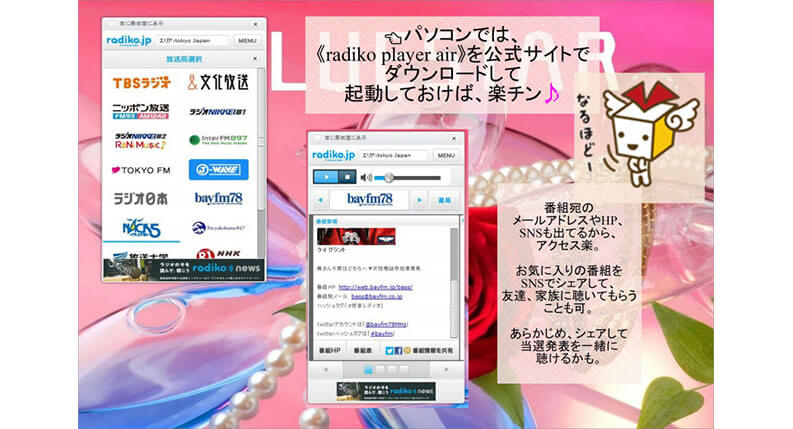 miki:他には、流してる音楽のタイトルやアーティストをリアルタイム表示してくれるFMの番組も多いので、気になったらチェックできるのもメリットです。「この番組何時まで?」「今のコーナー何だったっけ?」と思ったときにもすぐ目で確認できるので、応募するときに助かってます。あとメールアドレスも出てるので、ワンクリックで応募に取り掛かれますね!