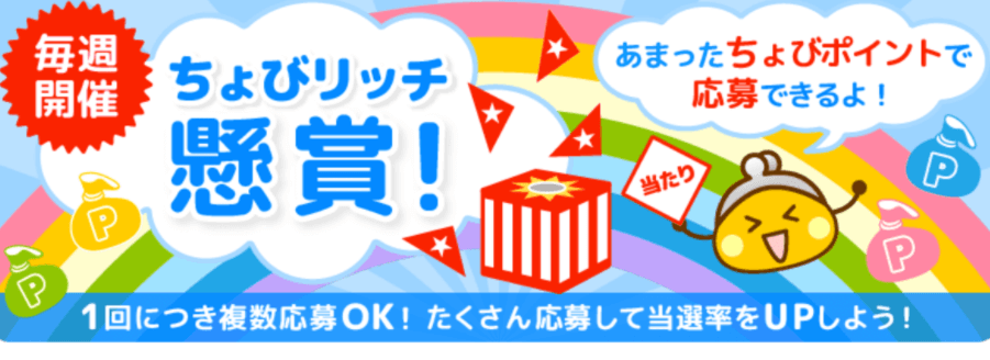 ちょびリッチは、サイト内で集められる「ちょびリッチポイント」を使って懸賞に応募できます。ポイントがキャッシュバックされる懸賞キャンペーンから、会員のランクがアップできる賞品などがメインとなっています。